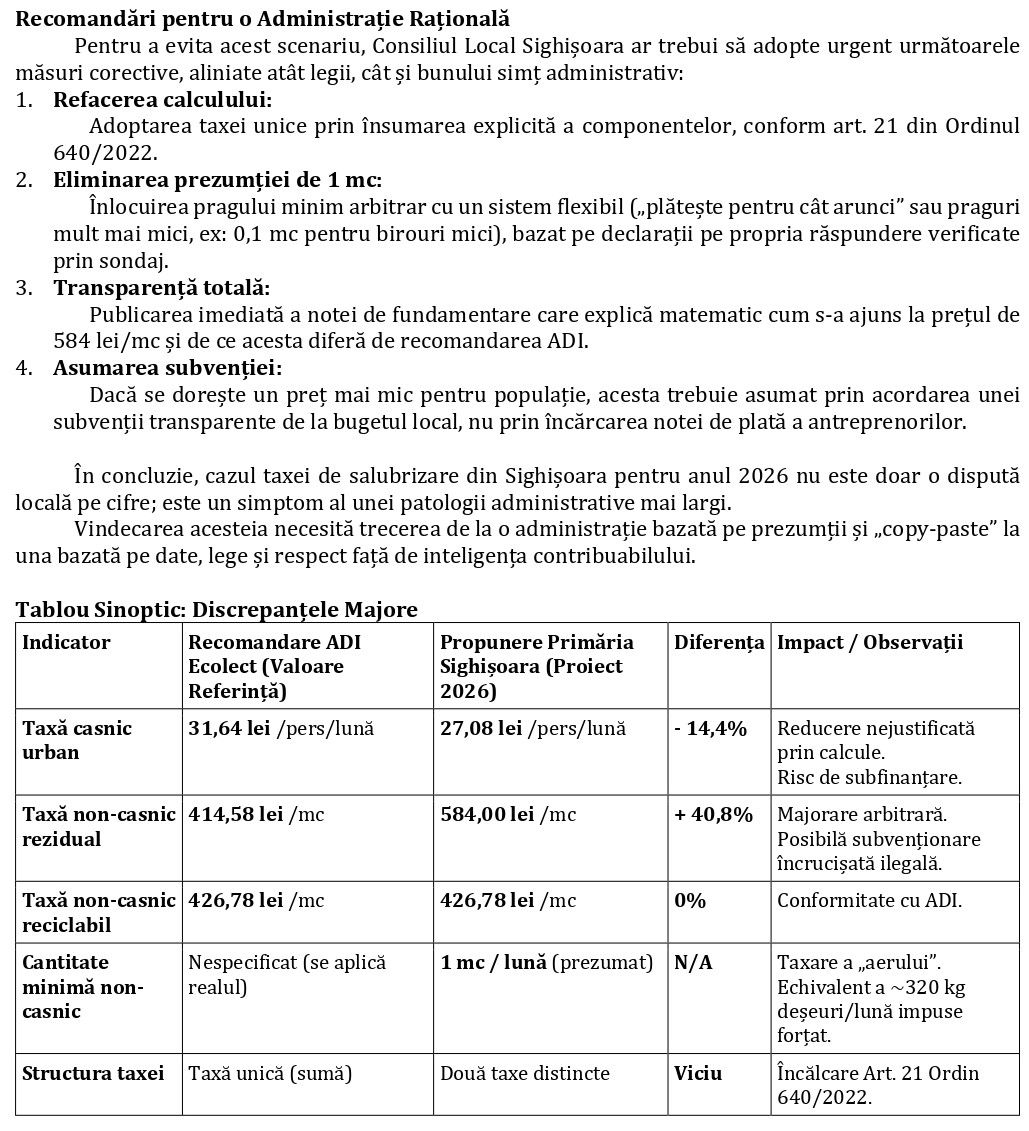 - Raport de specialitate privind aprobarea taxelor distincte de salubrizare începând cu anul 2026 pentru UAT-urile membre din Zona 3 Sighișoara