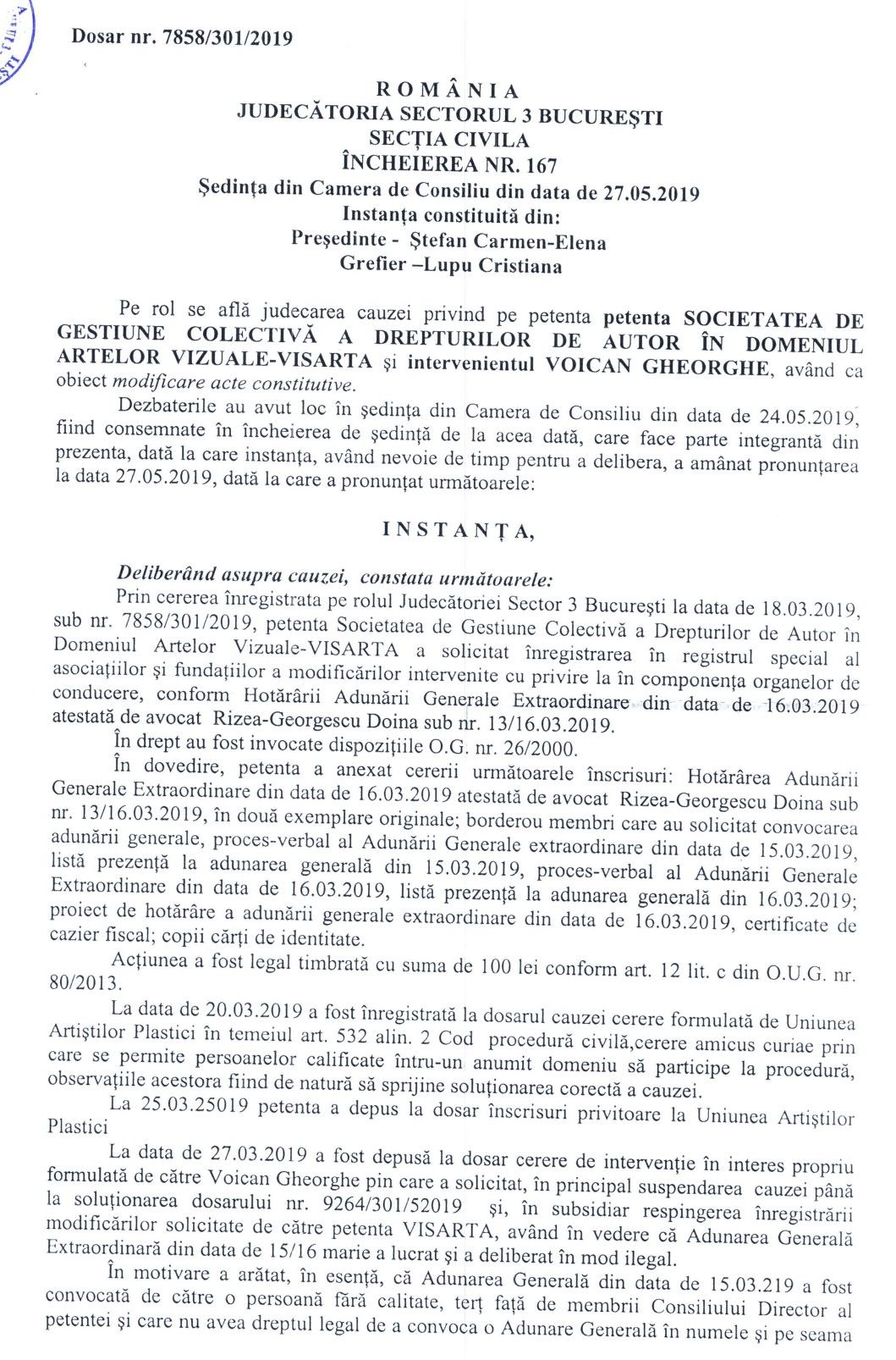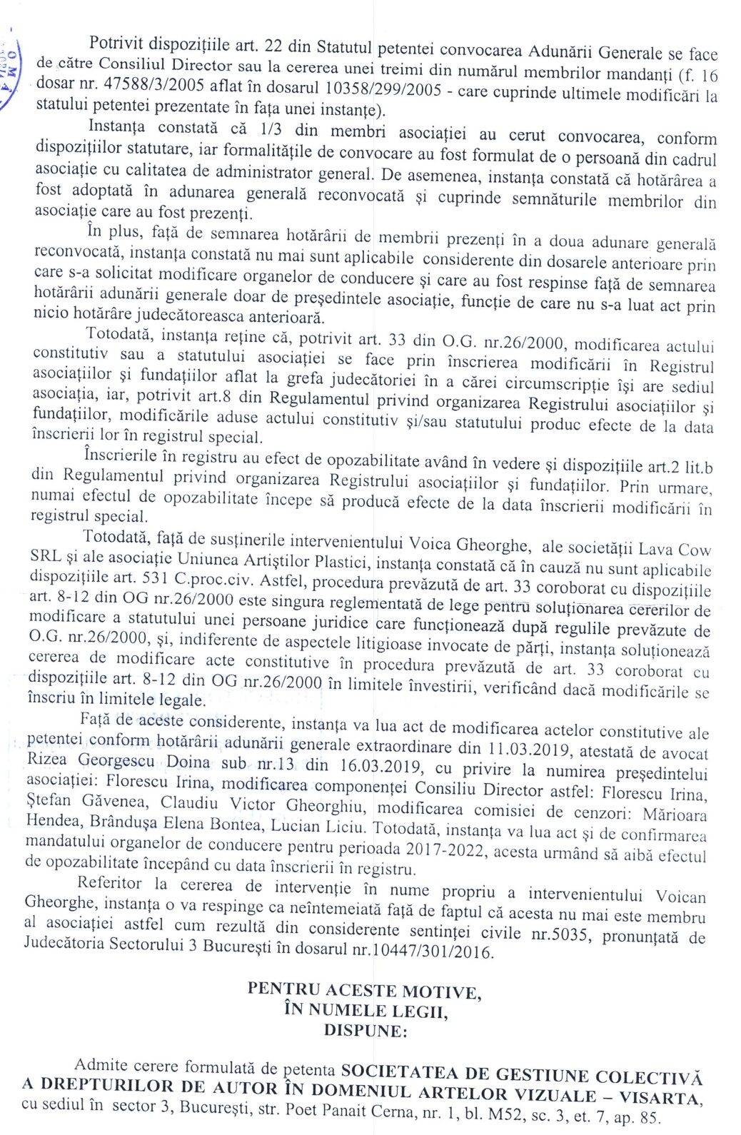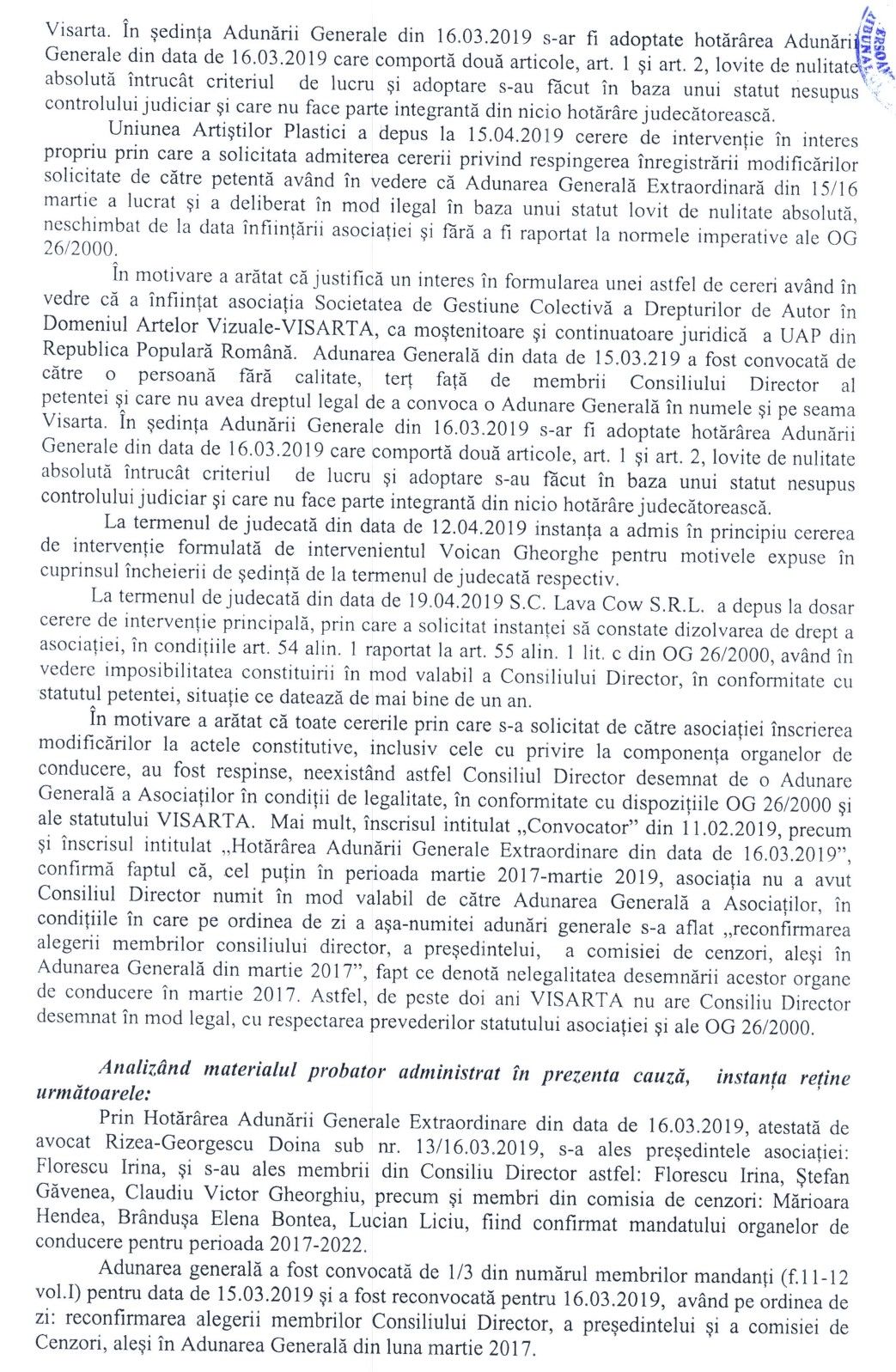 Hotărârea definitivă a instanței de judecată privind înregistrarea organelor de conducere ale VisArta