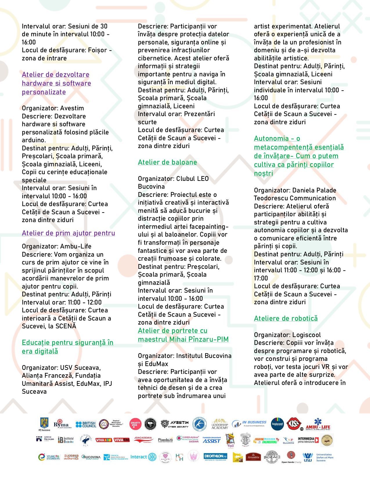 Parteneri educaționali: Muzeul Național al Bucovinei, British Council, Asociația Institutul pentru Parteneriat Social Bucovina, Librăriile Alexandria, Fundația Dana Voiculescu pentru Solidaritate, Ryma Youth Asociation, Centrul Pas cu Pas, Aripi în Europa, Hope For Humanity, Open Hands Charity, Logiscool, Fundația Umanitară Assist, Clever Children, Young Engineers, Avestim Cyber Security, Creative Engineering Suceava, Universitatea „Ștefan cel Mare” Suceava, Alianța Franceză, Joacademia, AM Leadership Academy, InBusiness, Daniela Palade Teodorescu Communication, Pixeda, Teatrul „Matei Vișniec” Suceava, Trupa Foli, Suceava Culturală, Decathlon, Sport for All Suceava Association, Centrul Educațional Sofia, Interact Suceava-Bucovina, LEO Bucovina, Asociația Ciprian Porumbescu, Ambu-Life, Smarty Kids, Bucovina Dance Studio. Parteneri media: Intermedia TV, VIVA FM, VIVA Kids, Monitorul de Suceava, Bucowina Plus, Kiss FM.