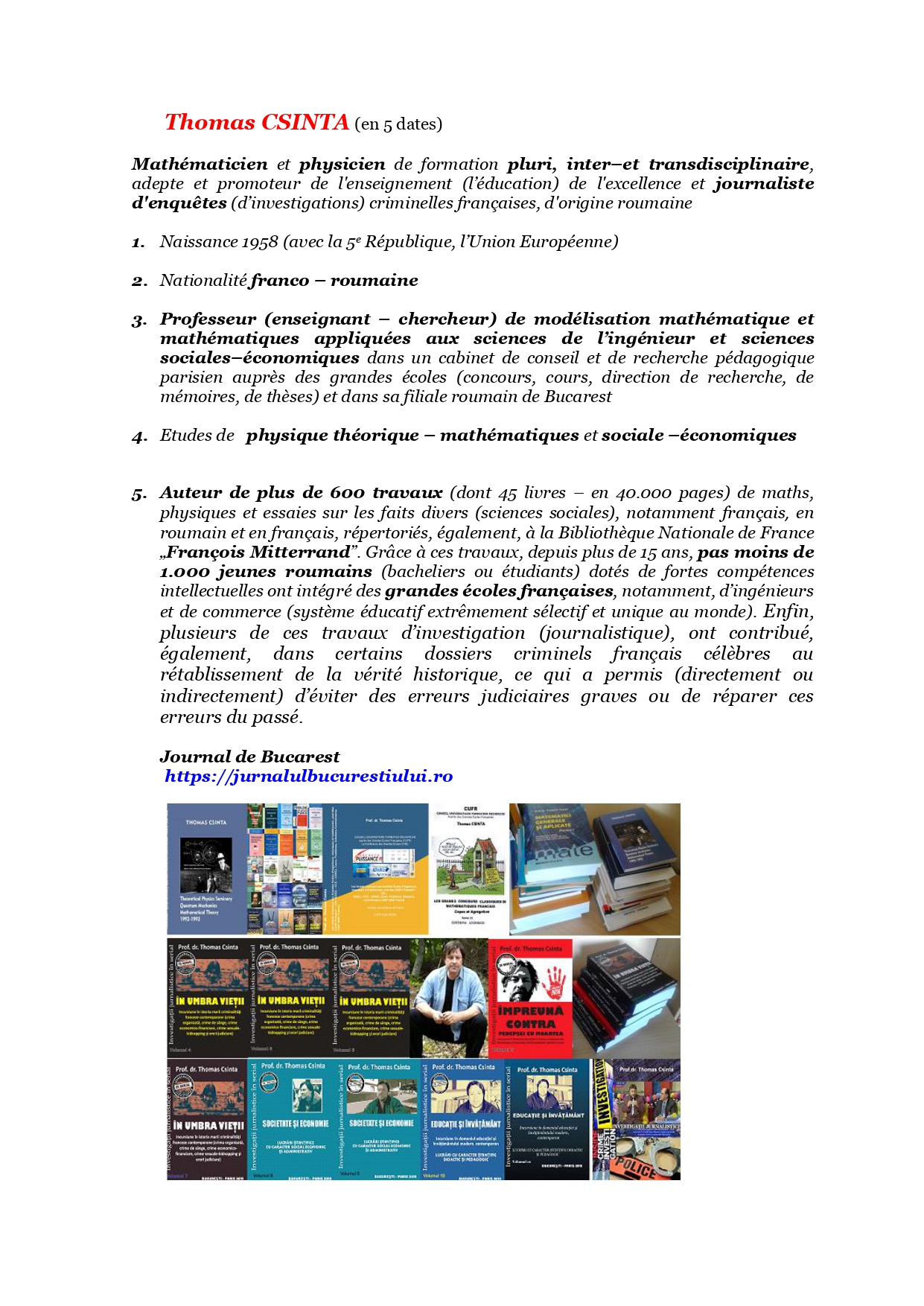 Notă. Am fost, în general (în principiu!), în relații apropiate cu echipa de la Charlie hebdo, dar în particular cu Tignous (Bernard Jean-Charles Verlhac), coleg de generație-cu care am discutat mult despre dosarul Yvan Colonna (presupusul asasin al prefectului de Corsica Claude Érignac pe 6 februarie 1998) comemorat anul trecut în lucrările mele „In memoriam Yvan Colonna. Corsica nu crede în lacrimi” în peste 1.000 de pagini pe care le-am prezentat la Conferinta anuală a Academiei româno-germane din Baden-Baden și îl voi prezenta și în acest an la Congresul Internațional al Universității Apollonia de lac Iași între 2-5 martie 2003, și mai ales cu polițistul lt. Frankie (Franck Brinsolaro), care asigura protecția lui Charbonnier, redactorul șef) originar din Toulon (Micul Chicago în anii de plumb și în perioada activității organizației criminale „French Conexion”, căreia am consacrat în lucrările mele, tot, peste 1.000 de pagini. În dimineata zilei de 7 ianuarie 2015, am trecut pe la redacție în jurul orei 09h30, dar n-am avut acces pentru că la ora 10h30 începea sedinta redactiei, la care participau numai membrii acesteia. Dedic aceste vaste lucrări de investigatie si cercetare stiintifică memoriei lor.