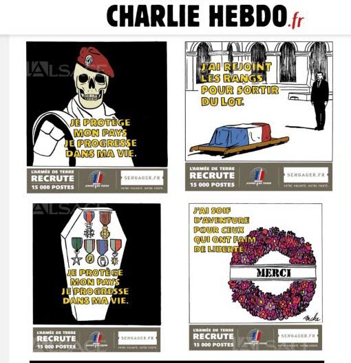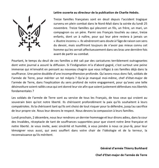 Iată, cum celebrul săptămânal satiric francez Charlie Hebdo a pus în evidență, de manieră umoristică, acest tragic accident (eveniment istoric) în edetiția sa din 2 decembrie 2019, tocmai în ziua în care, șeful Statului Major al Armatei Terestre franceze, Generalul de Armată Thierry Burkhard a adus un pios omagiu acestora în Curtea prestigiosului Hôtel des Invalides(un complex de clădiri în sectorul parizian 7 construit la ordinul lui Ludovic al XIV-lea între anii 1670 – 1676, care cuprinde muzee și monumente legate de istoria militară a Franței, precum și un spital și un azil pentru veteranii de război Unii dintre eroii Franței (inclusiv Napoleon Bonaparte) sunt înmormântați aici.Notă. Operațiunea Barkhane este o operațiune militară în Sahel (o amplă zonă de tranziție, de la deșertul Sahara la regiunea de savană Sudan, pe mari porțiuni din Senegal, Mauritania, Mali, Burkina Faso, Niger, Ciad, Etiopia și Sudan, situată în partea central-nordică a Africii, extinsă pe 3.053.200 km², având o lungime de 3.900 km, de la țărmul Oceanului Atlantic și până la Marea Roșie, cu o lățime care variază între 300 și 500 km la Sud de Sahara) și Sahara (cel mai mare deșert uscat, și al treilea cel mai mare dedin lume, după Antarctica și Arctica, de la țărmul Oceanului Atlantic până la Marea Roșie alcătuind un trapez cu o lățime în vest de 4.500-5.500 km, iar în nord-sud cu latura de 1500 – 2.000 km, cu o suprafață de 9.400.000 km², cuprinzând o treime din Africa – aproximativ suprafața Statelor Unite ale Americii, sau de 26 ori mai mare decât suprafața Germaniei) de către Forțele Armate Franceze sprijinite de către cele estoniene și britanice cu scopul de a lupta contra grupurilor armate salafist–jihadiste din zona geografică menționată.