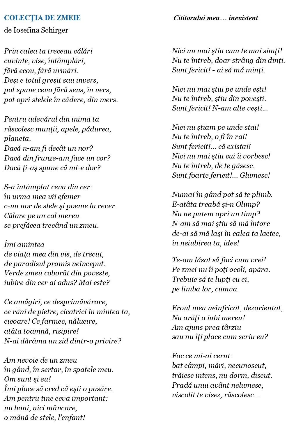 Dilema. Ceea ce am citit în „Colecția de zmeie” a Iosefinei Schirger este ceva nemaiîntâlnit, de neimaginat în secolul al XXI-lea. Este Luceafărul acestui veac. Dar mințile neinițiate nu conștientizează acest lucru. Construcția și structura Luceafărului lui Eminescu reflectă felul de a fi în poezie, al acelui secol. Construcția și structura Luceafărului ei corespunde structurii sofisticate, tehnologizate a timpului pe care îl parcurgem astăzi. De aceea Luceafărul Iosefinei arată la exterior altfel decât al lui Eminescu, dar profunzimea subiectului abordat în ambele poeme este comparabilă. Pentru ea, ca și pentru Eminescu, iubirea este o Dilemă irezolvabilă. Se zbat s-o rezolve, dar este în zadar pentru că iubirea lor face parte din altă lume, paralelă celei reale-lumea neantică, imponderabilă a sublimului. Iosefina, ca și Eminescu, se luptă cu sine în acest corsaj strâns și înăbușitor al Dilemei iubirii, neînțelegând ce caută și ce doresc de fapt, căutându-se pe sine în sine, pe sine în această lume neantică, metafizică, prin mijlocirea poeziei.