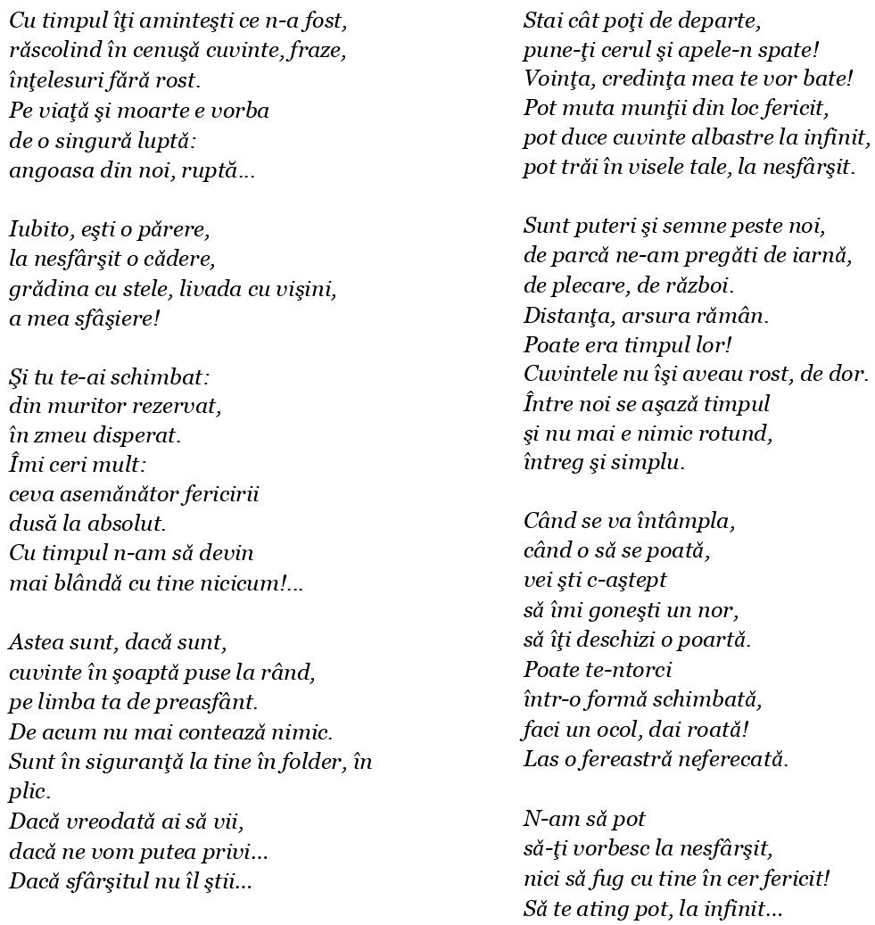 - De aici lupta tragică, nesfârșită și fără rezultat real, de aici cotradicția între ceea ce sunt şi doresc a fi. Ea nicidecum nu se poate regăsi pe potecile întortocheate ale Dilemei: ba parcă iubește, ba parcă nu. O carte a ei nu întâmplător se numește „Parcă te iubesc”: nu este în stare să iubească pe cineva cu adevărat, fiindcă acel cineva nu se înscrie în iubirea sa.