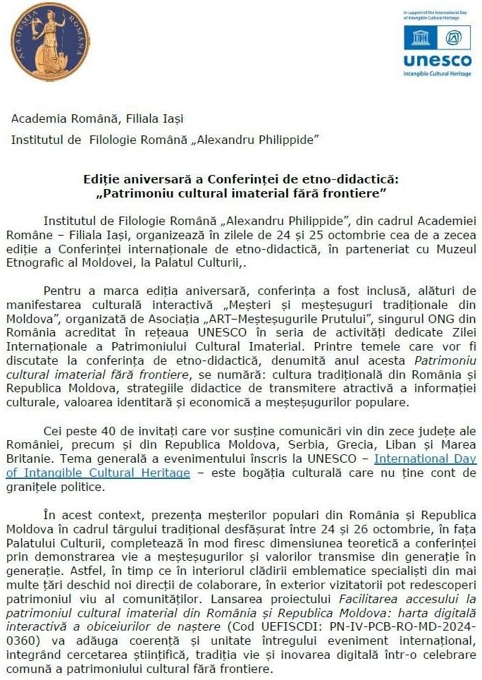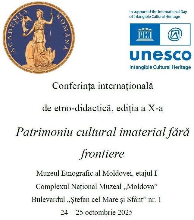 Conferința internațională de etno-didactică (ediția a X-a, 24 și 25 octombrie 2025) intitulată „Patrimoniu cultural imaterial fără frontiere”, reunește în spațiul Muzeului Etnografic al Moldovei, precum și online, specialiști din România, Republica Moldova, Grecia, Liban și Marea Britanie, care vor susține comunicări despre importanța moștenirii culturale în educația formală, nonformală și informală a tinerei generații, cu scopul de a identifica cele mai eficiente modalități de transmitere a culturii tradiționale locale și naționale.