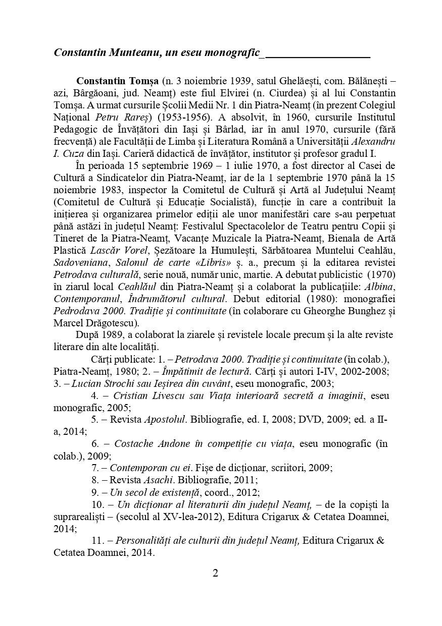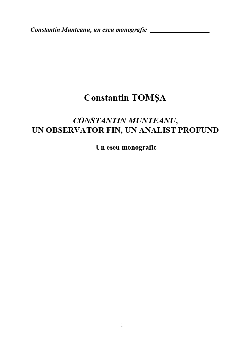 Constantin Tomșa: „Constantin Munteanu, un observator fin, un analist profund” (eseu monografic)