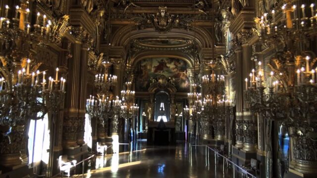 În timpul asediului Parisului și al Comunei din Paris în 1871, clădirea operei, încă neterminată, a fost folosită ca depozit pentru bunuri, precum și ca închisoare militară. Opera a fost inaugurată în cele din urmă pe 5 ianuarie 1875. Mulți dintre cei mai cunoscuți monarhi ai Europei au participat la ceremonia de deschidere, inclusiv președintele noii Republici Franceze, mareșalul MacMahon, primarul Londrei și regele Alfonso al XII-lea al Spaniei. Oamenii care au intrat în clădire au fost uimiți de dimensiunea sa uriașă și de ornamentațiile bogate. Doar Claude Debussy a descris-o ca fiind asemănătoare unei stații de cale ferată din exterior spunând că interiorul ar putea fi ușor confundat cu o baie turcească.