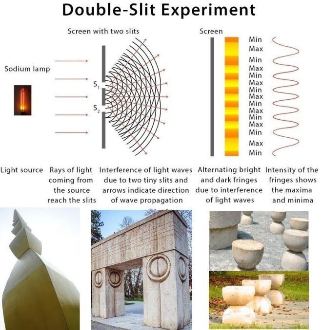 Iată indicii. Strămutat la Paris, Brâncuși a fost aproape de izvoarele și creuzetul mecanicii cuantice. Așa încât nu-i surprinzător că monumentala sa tripletă poate fi privită ca o uriașă machetă a legendarului micro-experiment lansat de Thomas Young, dar fundamentat de ducele francez Louis de Broglie, contemporan cu Brâncuși.