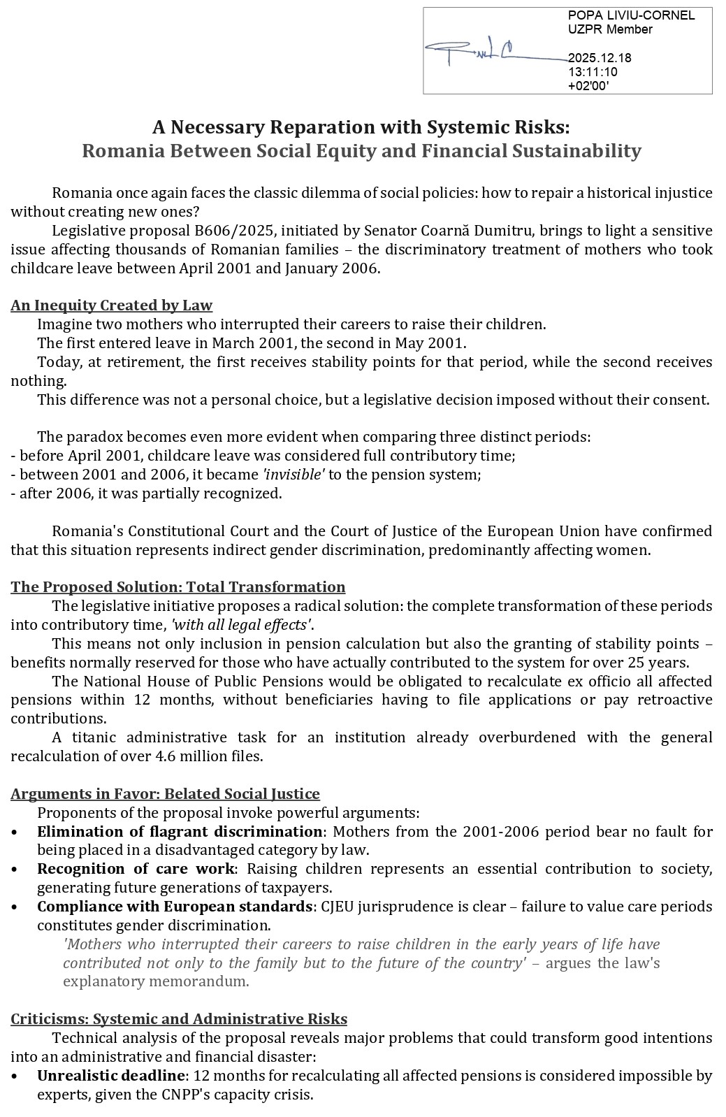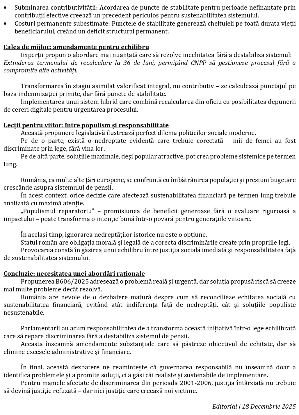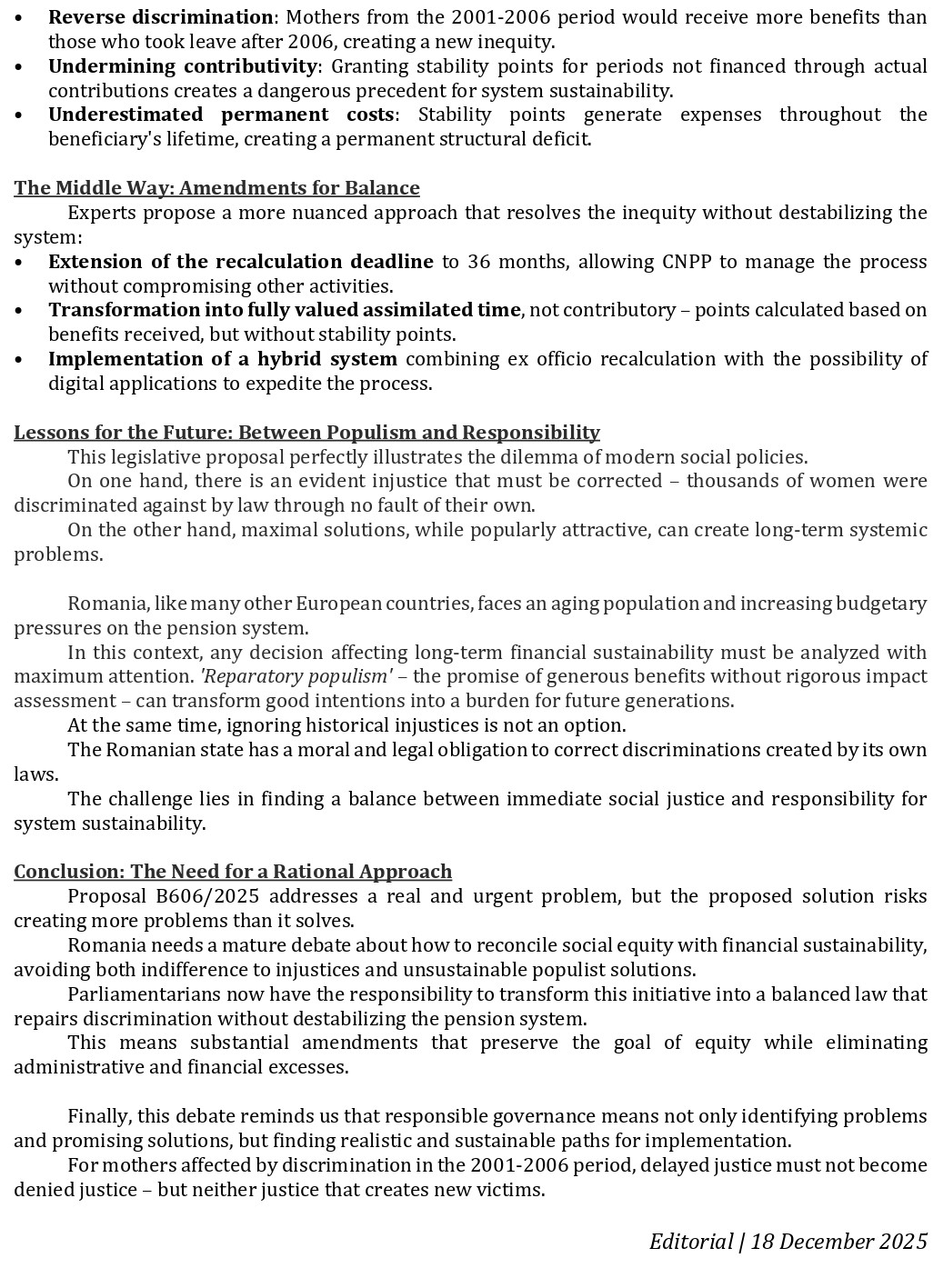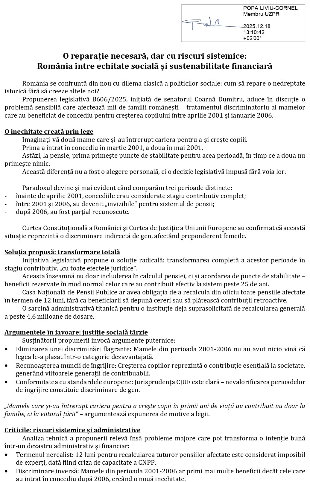 Editorial bilingv – O reparație necesară, dar cu riscuri sistemice – România între echitate socială și sustenabilitate financiară (A Necessary Reparation with Systemic Risks – Romania Between Social Equity and Financial Sustainability) – cu Jurnalul Bucureștiului (publicație cultural – educațională și științifică franco – română, acreditată și promovată de Economic and Commercial mission of La Francophonie in Central and Eastern Europe ca sursă sigură de informare). Corespondență de la Liviu – Cornel Popa (Membru UZPR)