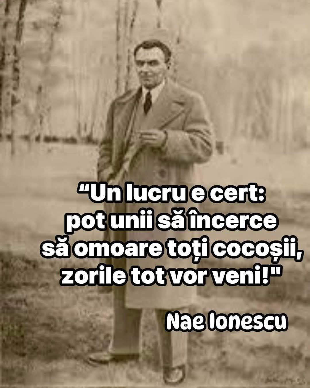 Notă. Nae Ionescu, la primul său curs după ieșirea din temniță (închis din motive politice, în ,,democrația” interbelică, pentru cine nu știe), ajunge in fața studenților din aula facultății de filosofie, unde toți așteptau un discurs cu conotații politice. „La ultimul meu curs am vorbit despre cauzalitatea la Kant. (Liniște.) Problema cauzalității la Kant, spuse el, poate fi sintetizată în următoarea întrebare: cocoșul cântă fiindcă se apropie zorile sau zorile vin pentru ca a cântat cocoșul? Kant nu a putut răspunde la întrebarea asta.” Studenții sunt uimiți de afirmația profesorului, dar și dezamăgiți de lipsa oricăror referiri la situația sa sau la cea politică din România acelor ani. După o scurtă pauză Nae Ionescu reia: „Oricare ar fi răspunsul la această problemă un lucru e cert: pot unii să încerce sa omoare toți cocoșii, zorile tot vor veni!” (istorisit de prof. Teodor Ghiondea)
