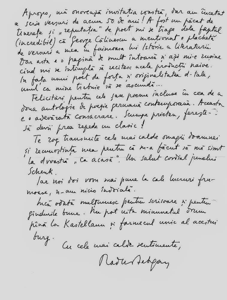 Mă bucur că am găsit în Germania un spirit înrudit, cu preocupări apropiate de ale mele și desigur că, în măsura posibilităților, aș dori să vă fiu de ajutor. Nu știu în ce măsură ideile, opțiunile și gusturile mele ar coincide cu ale Dumneavoastră, însă un dialog ar fi – cred eu – interesant pentru ambele părți. Dintre numele unor confrați pe care observ că i-ați consultat deja, unele îmi sunt apropiate, fără să vă ascund însă faptul că altele îmi sunt străine, în sensul că nu împărtășim (și nu am împărtășit nici în trecut) opțiuni și idei literar-politice, făcând parte din grupări literare opuse, eu fiind tot timpul mai apropiat de cercul „României literare“ și de aripa liberală a obștii scriitoricești, unde am avut și câteva luări de poziție illo tempore, inclusiv în cazul plagiatului lui Eugen Barbu (ceea ce mi-a atras ostilitatea grupului de la „Săptămâna“ și „Luceafărul“ etc.). Xenofobia și mai recent antisemitismul și șovinismul pe față al unor membri din fostele redacții ale revistelor pomenite mai sus mi-au rămas cu totul străine și le resping cu toată tăria.