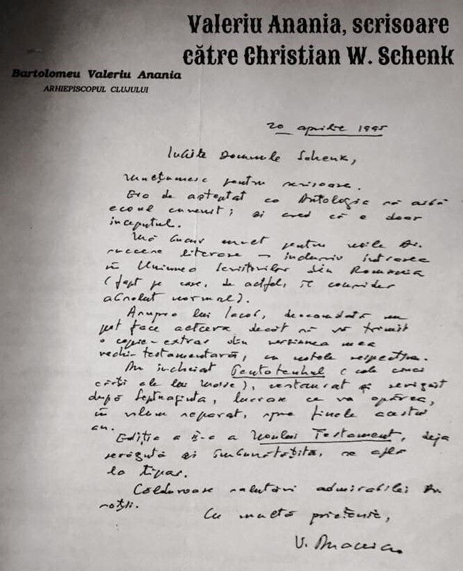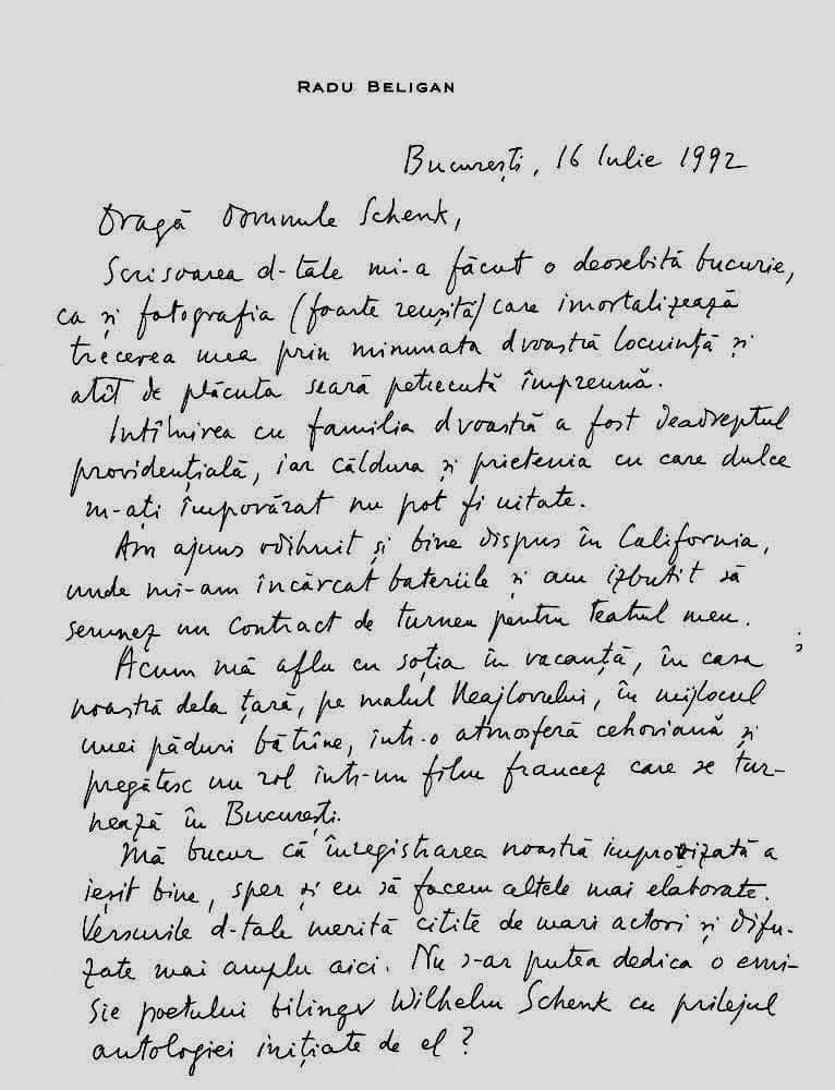 P.S. A apărut recenzia mea la ultimul dumneavoastră volum: Răstignirea…în numărul 2–3 al revistei Viața românească. V-am păstrat un exemplar pe care îl veți primi în noiembrie. Vă anexez trimiterea bibliografică din Literatorul, pentru „Prezență poetică în literatura română” C. W. Schenk.
