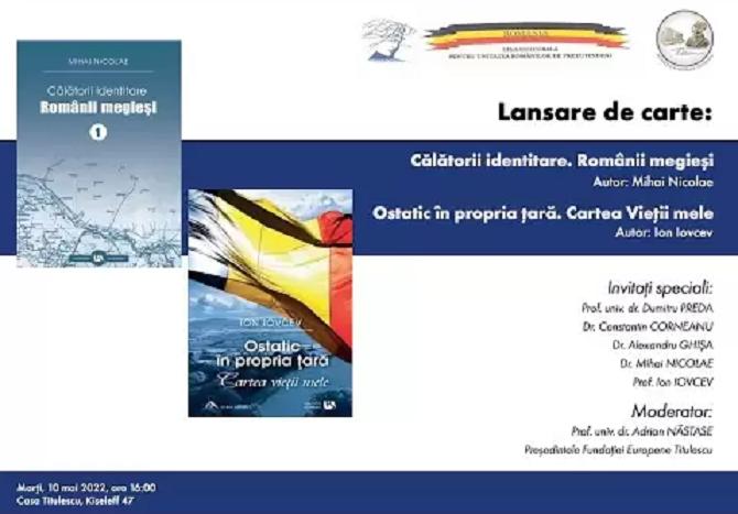 Fundația Europeană Titulescu organizează marți, 10 mai 2022, începând cu ora 16h00, lansarea cărților:  „Călătorii identitare. Românii megieși”  Autor: Mihai Nicolae și „Ostatic în propria țară. Cartea Vieții mele”. Autor: Ion Iovcev