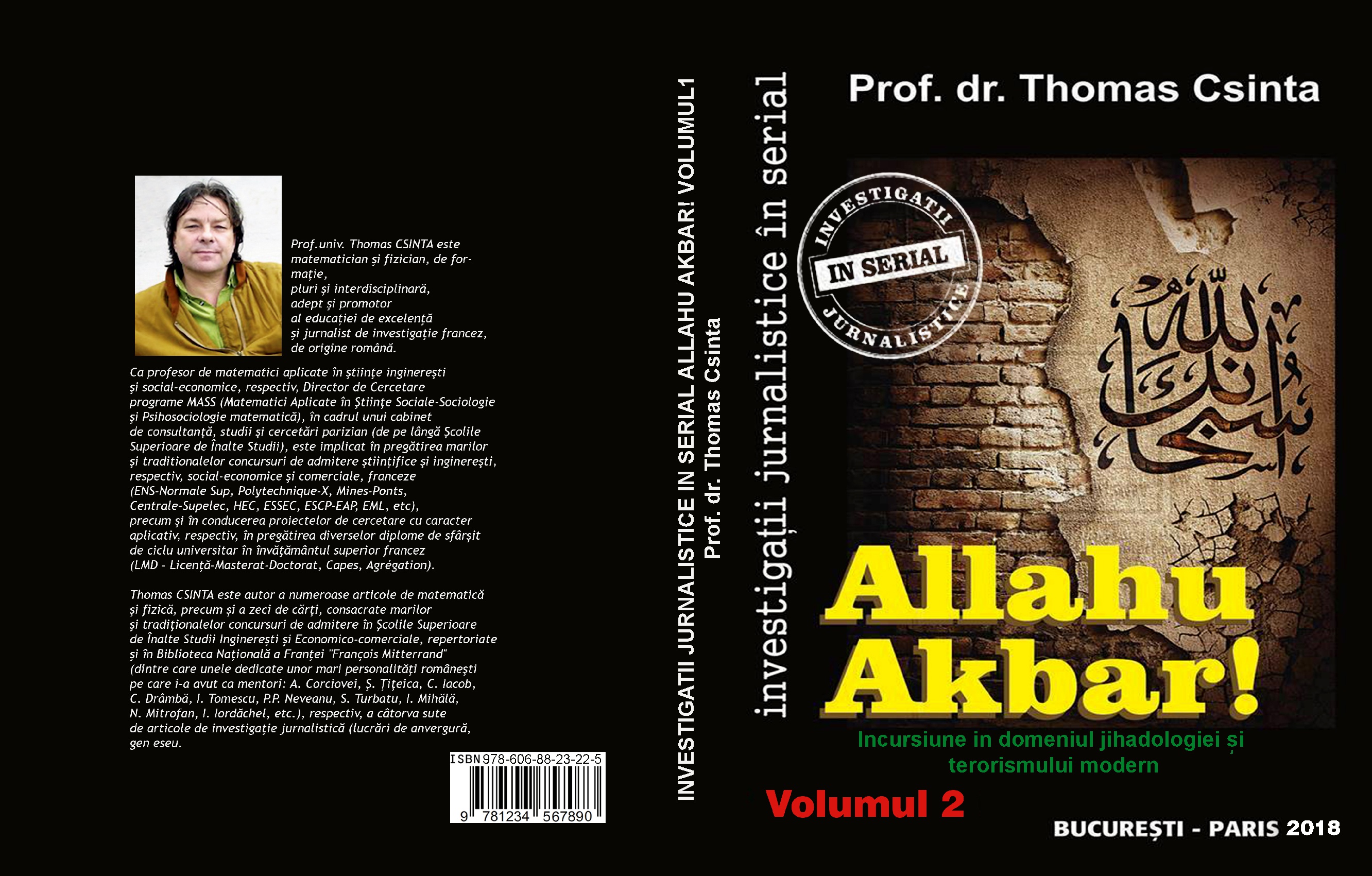 „Allahu Akbar” („Mai strălucitor decât 1.000 de sori”) în peste 5.000 de pagini. Terorismul modern, contemporan. Jihadologia. Incursiune în istoria marilor atacuri (atentate) teroriste ale lumii contemporane (Corespondență din Franța – prof. univ. dr. Thomas CSINTA, jurnalist de investigații criminale, atașat de presă al Poiliției Capitalei și al OADO – Națiunile Unite)
