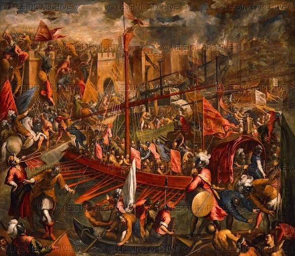 Cruciații cuceresc Constantinopolul în 1204( Tintoretto, Palatul Ducal, Venetia)