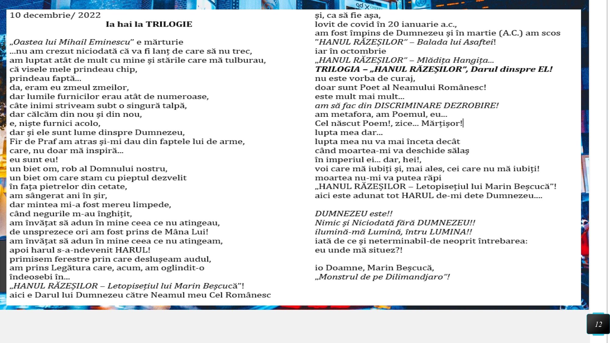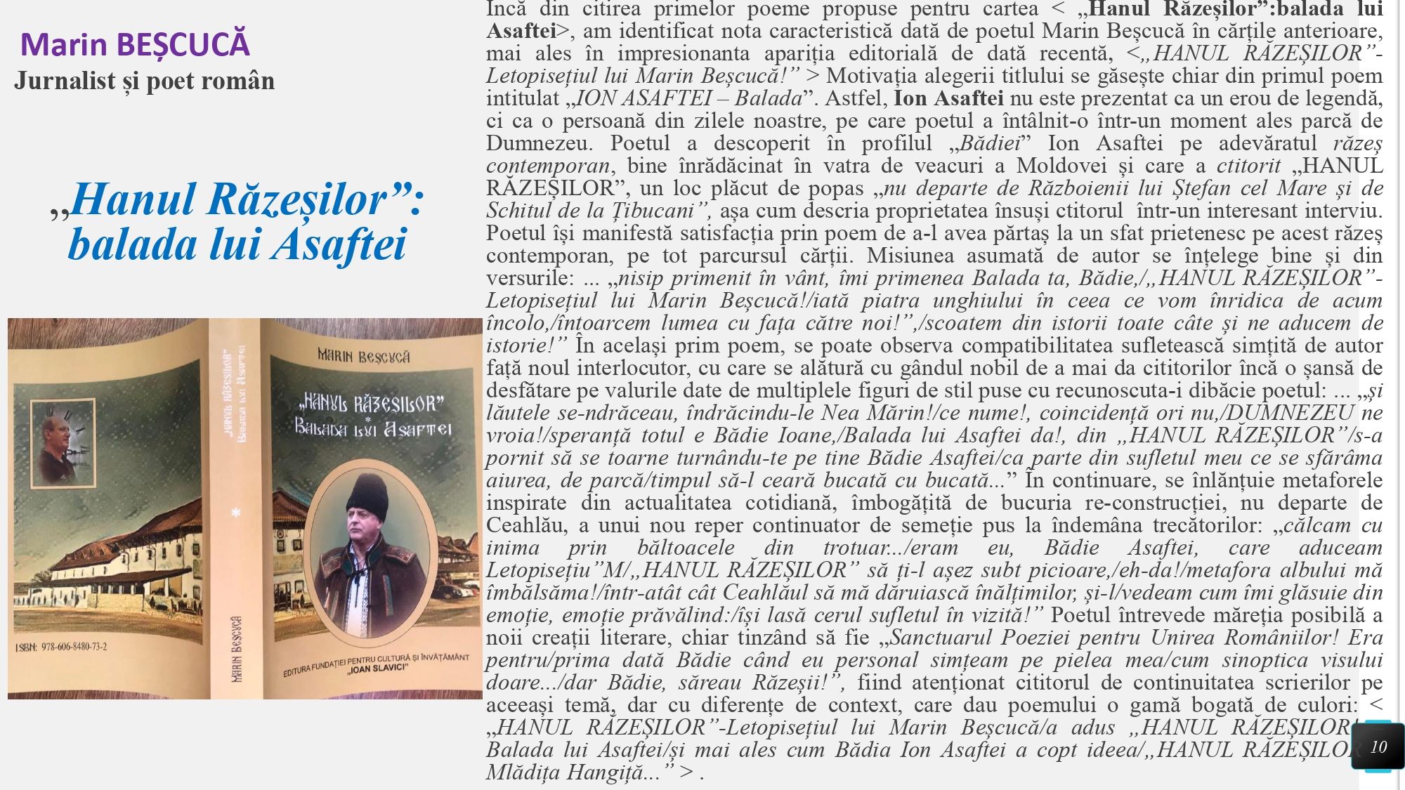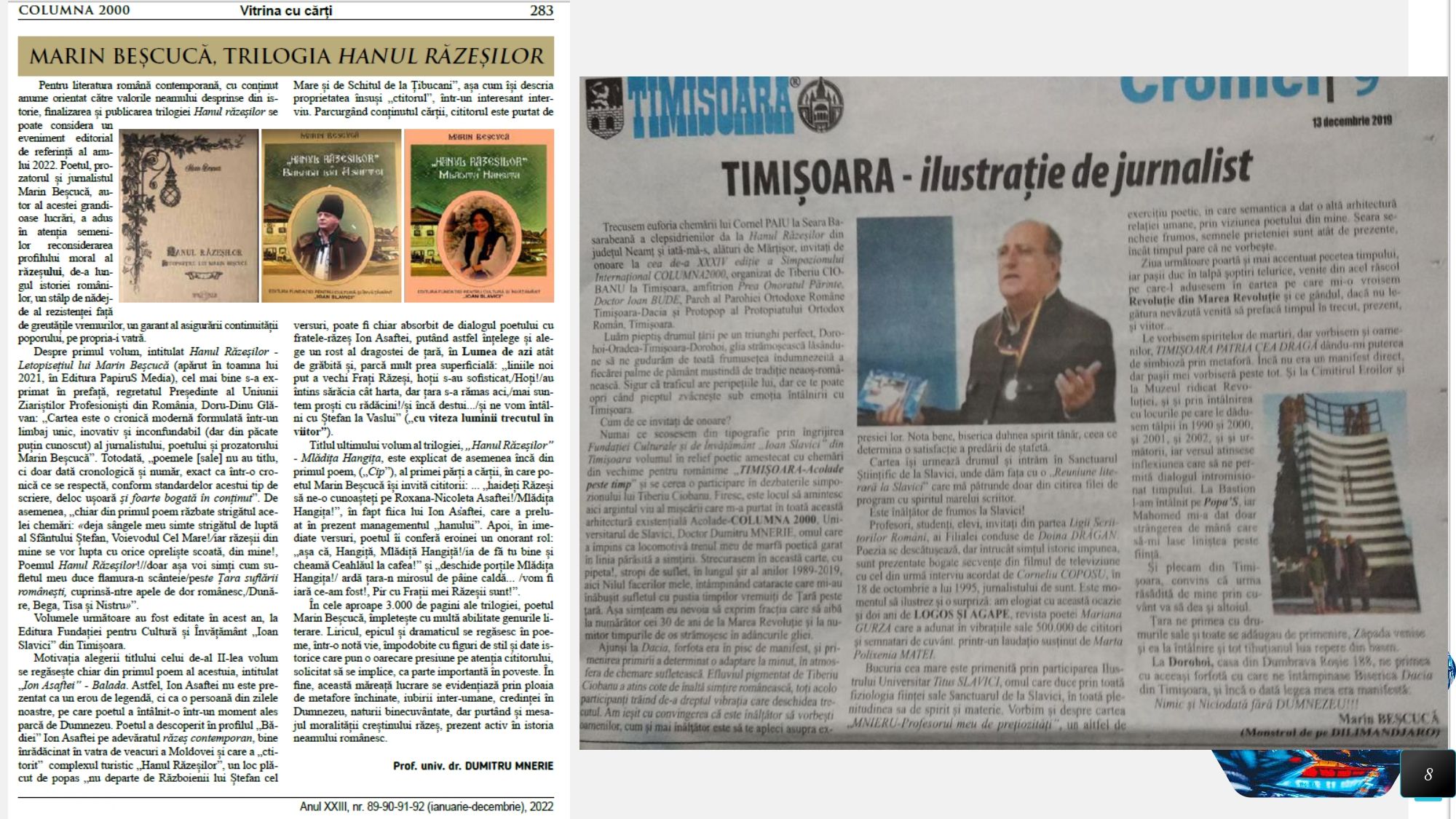 „Hanul Răzeșilor”–Letopisețiul lui Marin Beșcucă. Letopisețul metaforei de atitudine. Ultimile rânduri scrise de Doru – Dinu Glăvan (fostul președinte al Uniunii Ziariștilor Profesioniști din România). Corespondență de la Pompiliu Comșa (Prof. univ. asoc. Univ. Apollonia, directorul ziarului Realitatea, directorul executiv al Trustului de Presă Pompidu – Iași)