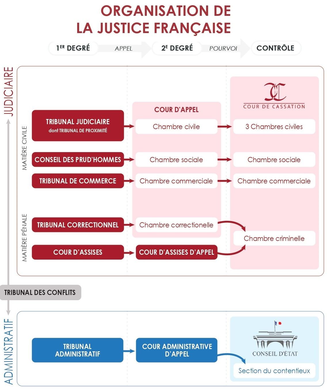 Le système judiciaire français est organisé en deux ordres distincts, l’ordre judiciaire pour les litiges entre particuliers et les affaires pénales, et l’ordre administratif pour les litiges impliquant l’État. Au sein de chaque ordre, les juridictions sont structurées de manière hiérarchique, avec des tribunaux de première instance, des cours d’appel et la Cour de cassation (pour l’ordre judiciaire) ou le Conseil d’État (pour l’ordre administratif) comme juridictions suprêmes. La place du système judiciaire est définie par le principe de la séparation des pouvoirs, lui assurant une autonomie et une indépendance des pouvoirs législatif et exécutif.