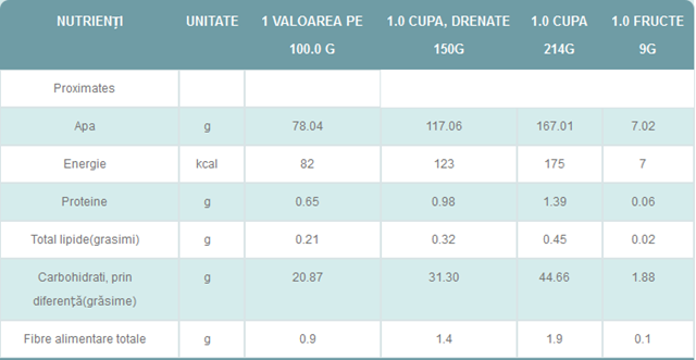 Acest fruct este foarte bogat in vitamina C, continutul este zemos iar gustul este unul dulce-acrisor. De asemenea, este foarte slab caloric – are doar 82 kcal/100g.
