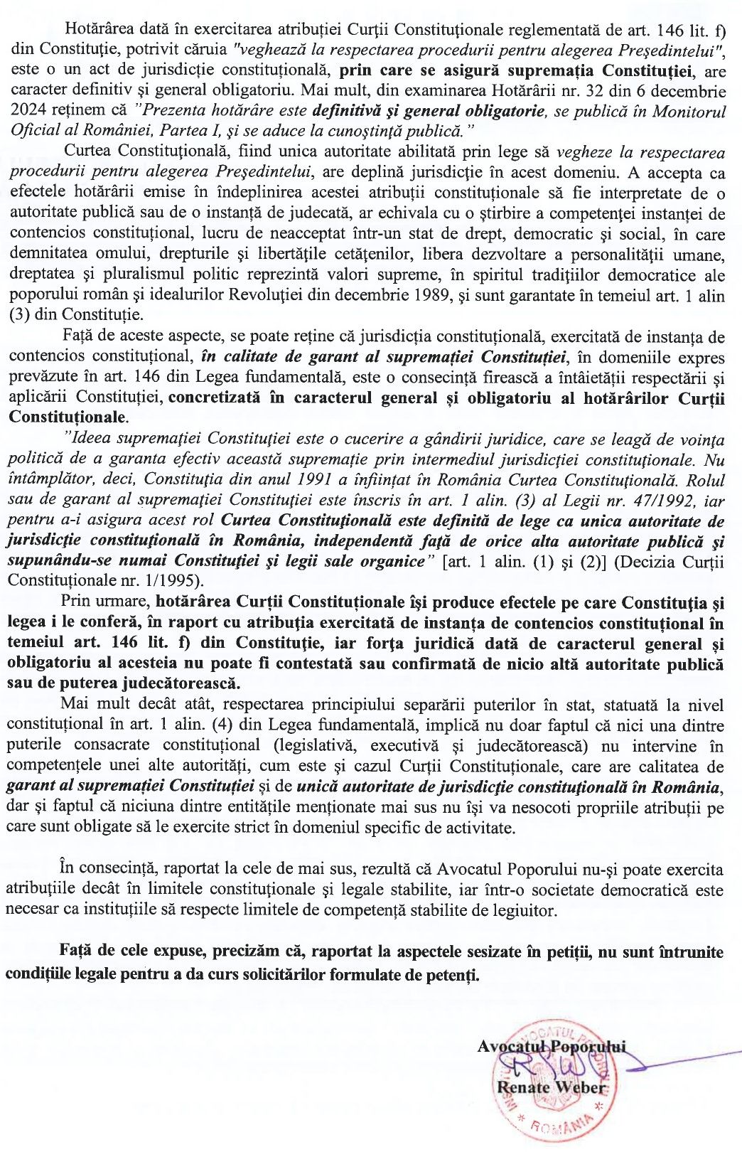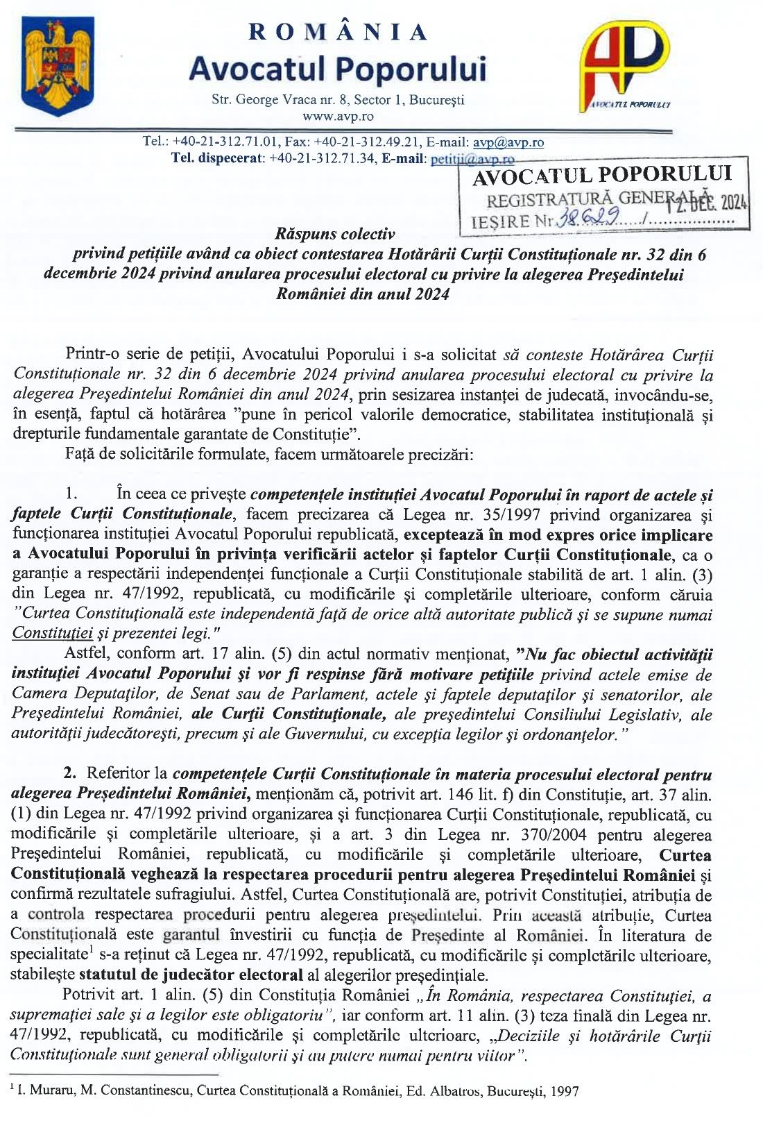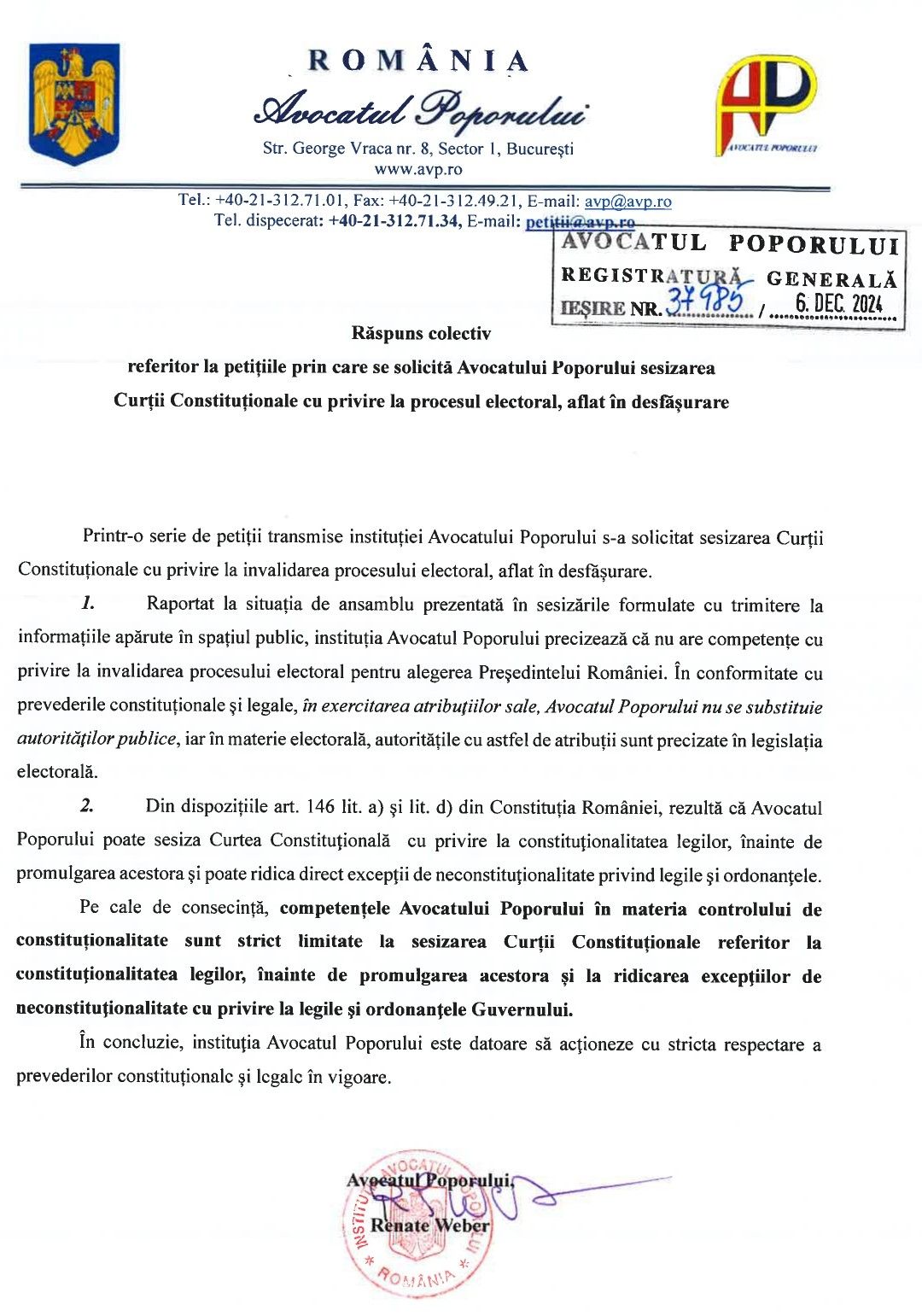Ca răspuns la petițiile publice adresate Avocatul Poporului în decembrie 2024 cu privire la deciziile Curții Constituționale, instituția Avocatul Poporului a publicat aici și aici răspunsuri către cetățenii care susțin că drepturile le-au fost încălcate de către președenție sau Curtea Constituțională prin prelungirea arbitrară a mandatului cetățeanului Klaus Iohannis în funcția de președinte în contextul anulării alegerilor prezidențiale. Instituția Avocatului Poporului, creată pentru a proteja drepturile cetățenilor și pentru a asigura respectarea principiilor constituționale, și-a dezvăluit o serie de limite și, implicit, lipsa de asumare într-o situație care a ridicat întrebări fundamentale despre statul de drept. Răspunsurile primite la petițiile cetățenilor privind anularea procesului electoral prezidențial din 2024 și prelungirea mandatului cetățeanului Klaus Iohannis în funcția de președinte demonstrează o abordare defensivă și restricționată, ceea ce poate diminua încrederea publicului în această instituție esențială.